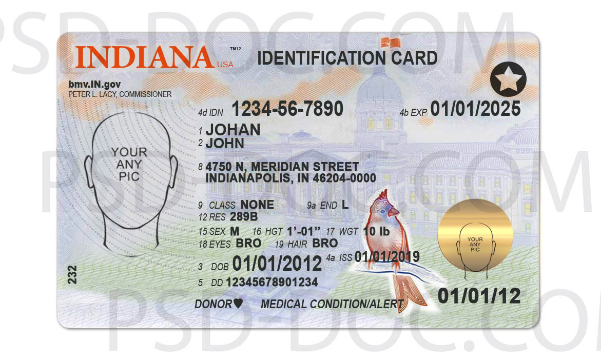 PSD Template USA Indiana Driver License front + back (for make a DL with any name/dob/address)