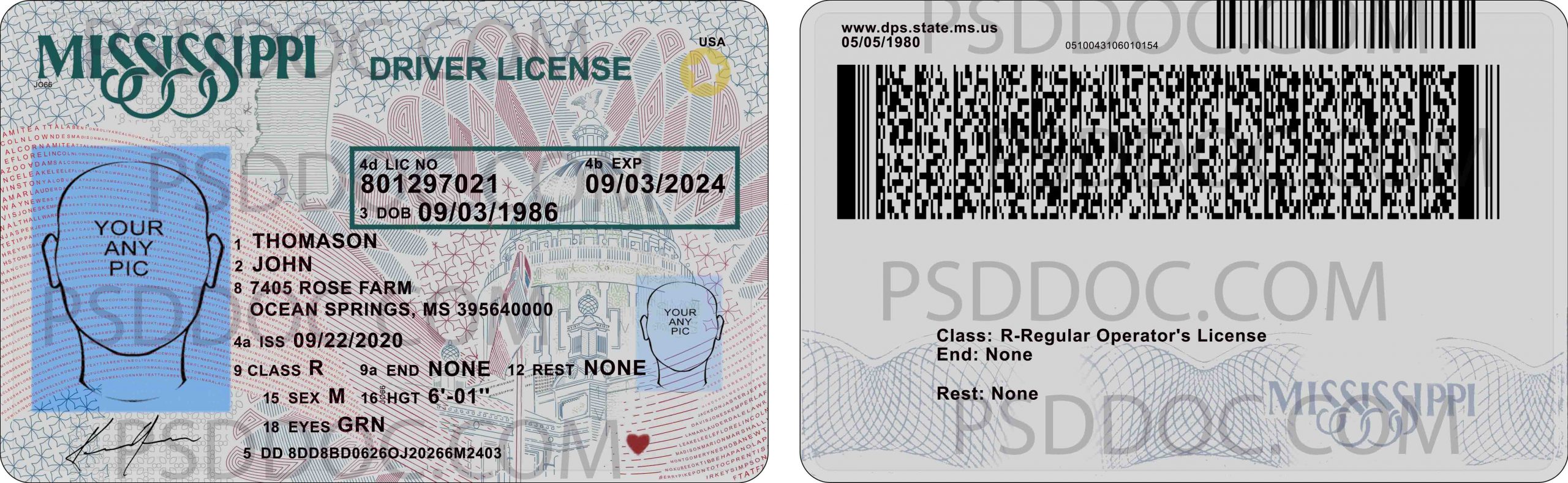 PSD Template USA Missisipi Driver License front back side (for make a DL with any name/dob/address)